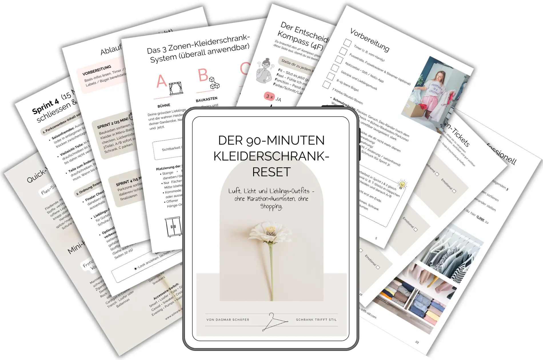 Das 3-Zonen-Prinzip in einfachen Worten, der 4F-Entscheidungs-Kompass mit Schnellregeln, eine schlanke Vorbereitung (Timer, Körbe, Labels) und Mindset & Tempo für zügige Entscheidungen ohne Druck. -